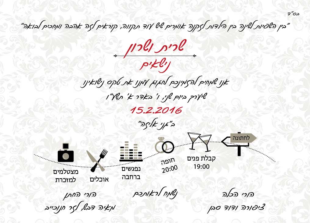 אנחנו מדפיסים את ההזמנות על נייר כרומו איכותי 300 גר’.ההדפסה דו-צדדית וצבעונית.המחיר כולל גם קובץ תמונה דיגיטלי לשליחה בוואטסאפ.לאחר מילוי כל הפרטים וביצוע הזמנה תקבלו מאיתנו סקיצה לאישור.